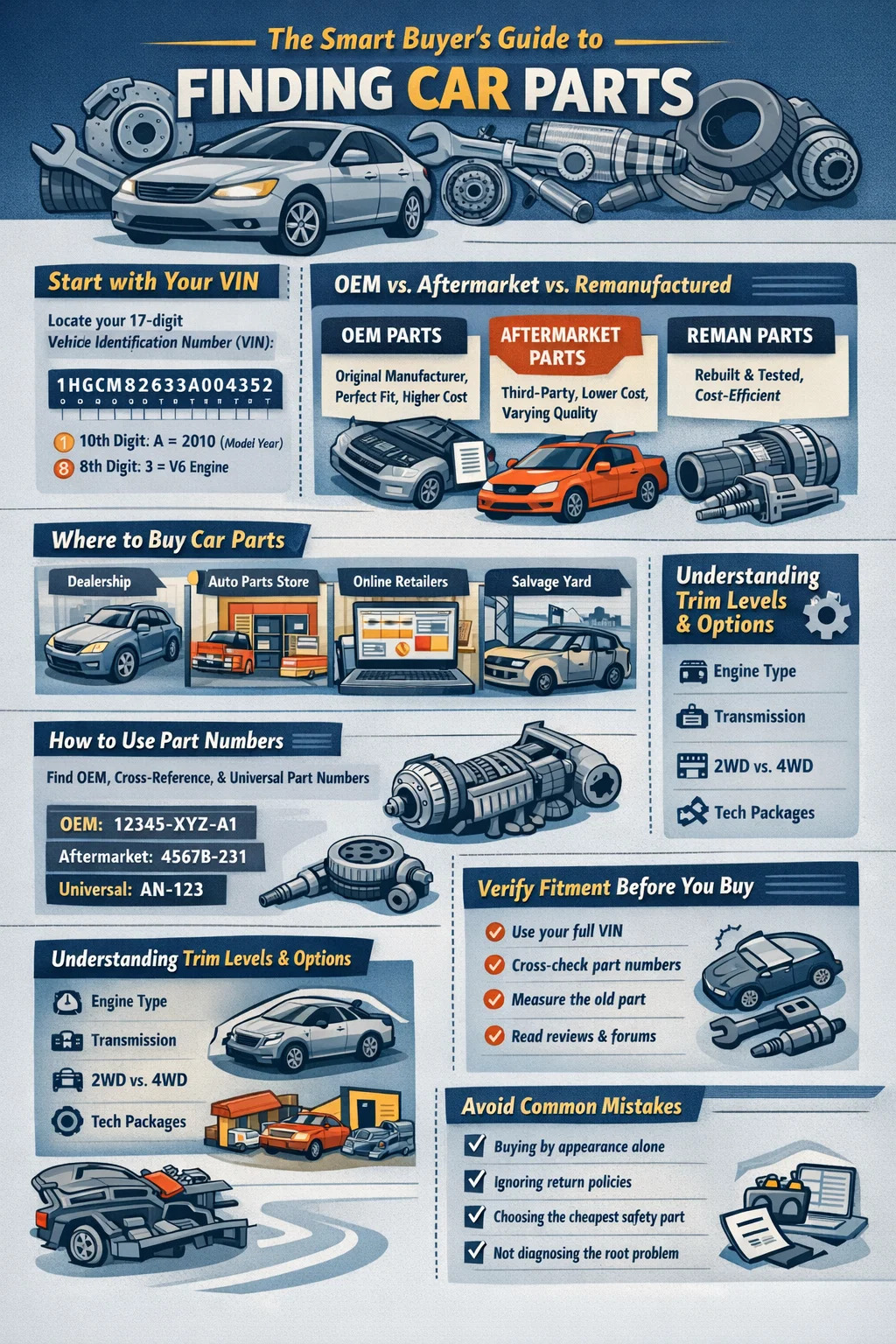 Encontrar las piezas adecuadas para su automóvil se reduce a un punto de partida no negociable: Debe conocer el año, la marca, el modelo, el tamaño del motor y el nivel de equipamiento de su vehículo antes de buscar cualquier parte del automóvil . Sin esta información, incluso una pieza que parece idéntica puede no encajar o no funcionar correctamente. Una vez que haya bloqueado esos detalles, el proceso se vuelve mucho más sencillo, ya sea que esté comprando en un concesionario, un minorista en línea, un desguace o una tienda de repuestos para automóviles. Esta guía recorre cada paso de ese proceso con detalles prácticos.