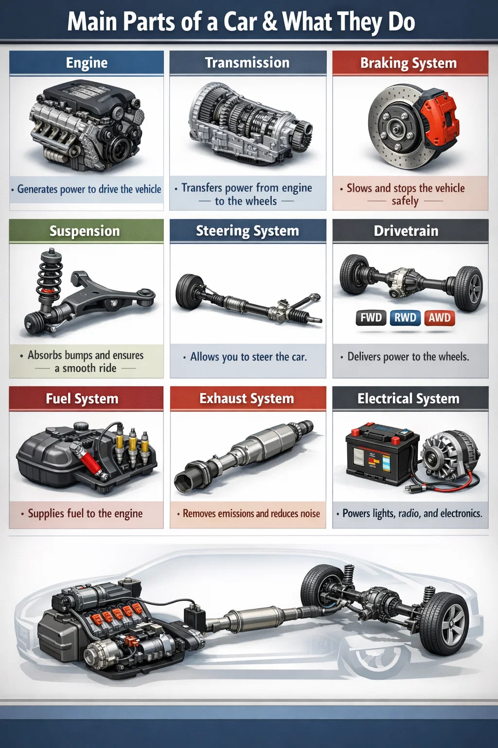 Understanding parts of cars and what they do is not just for mechanics. It helps everyday drivers recognize warning signs earlier, make smarter repair decisions, avoid being overcharged at the shop, and extend the lifespan of their vehicles. A well-maintained car can exceed 200,000 miles — but only if its components are understood and treated correctly.