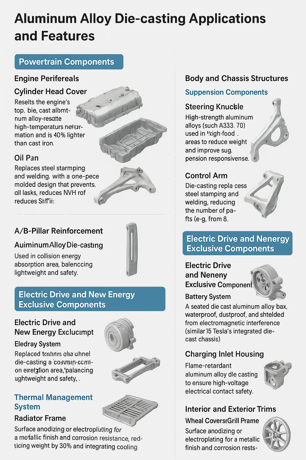 Piezas automotrices de aleación de aluminio de aluminio de dado son un controlador clave para la luz liviana y la mejora del rendimiento automotriz. Utilizando una fundición de alta presión, la aleación de aluminio se elabora en componentes estructurales complejos, reemplazando los componentes de acero tradicionales. Las siguientes son sus aplicaciones y características principales: