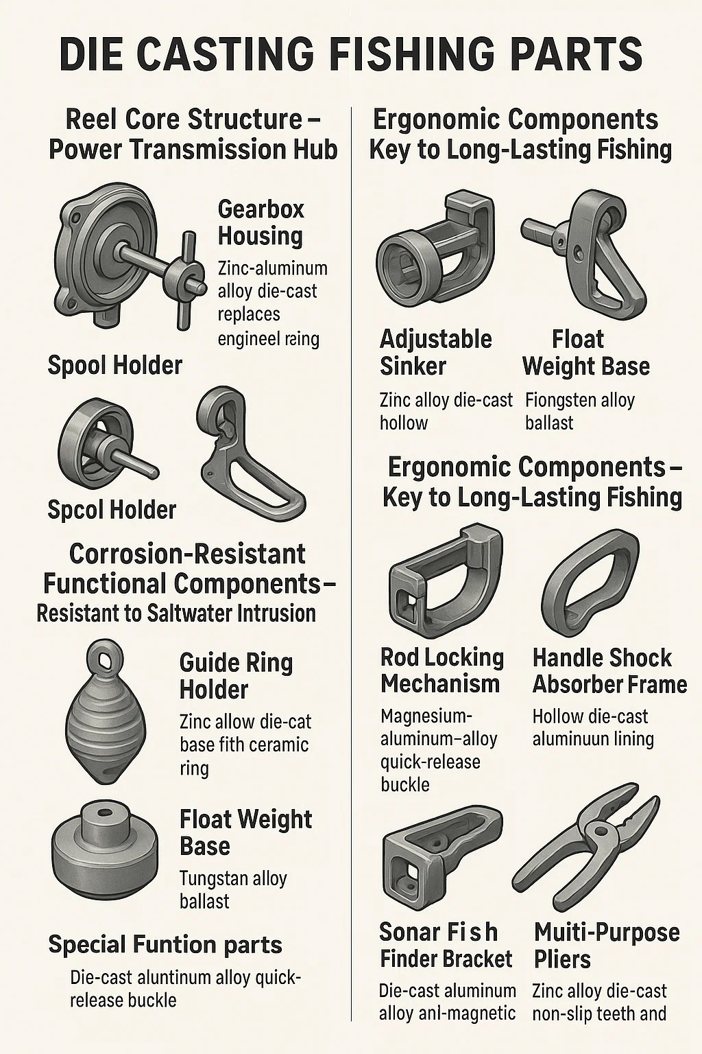 Partes de pesca de fundición a muerte son componentes de metal central fabricados utilizando un proceso de fundición de alta presión. Abordan los requisitos clave de tackle de pesca, como peso ligero, resistencia a la corrosión y confiabilidad funcional. Las aplicaciones y características clave son las siguientes: