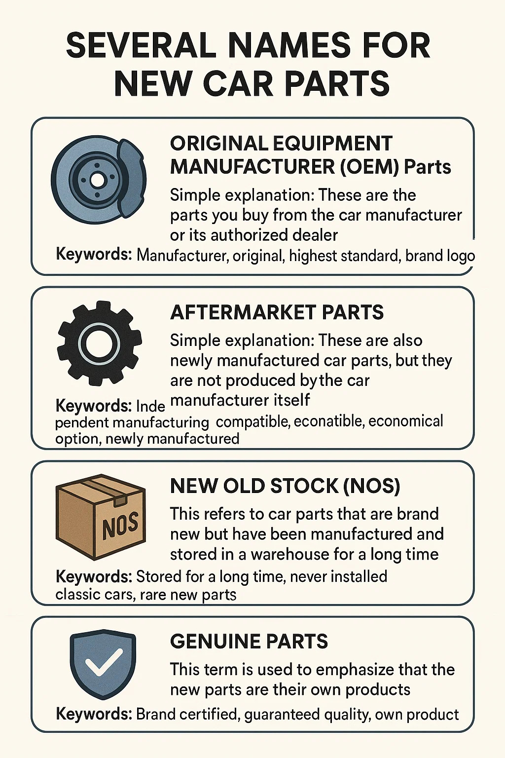 Nuevo piezas de auto Tienen varios nombres comunes, que difieren ligeramente según su origen y naturaleza.