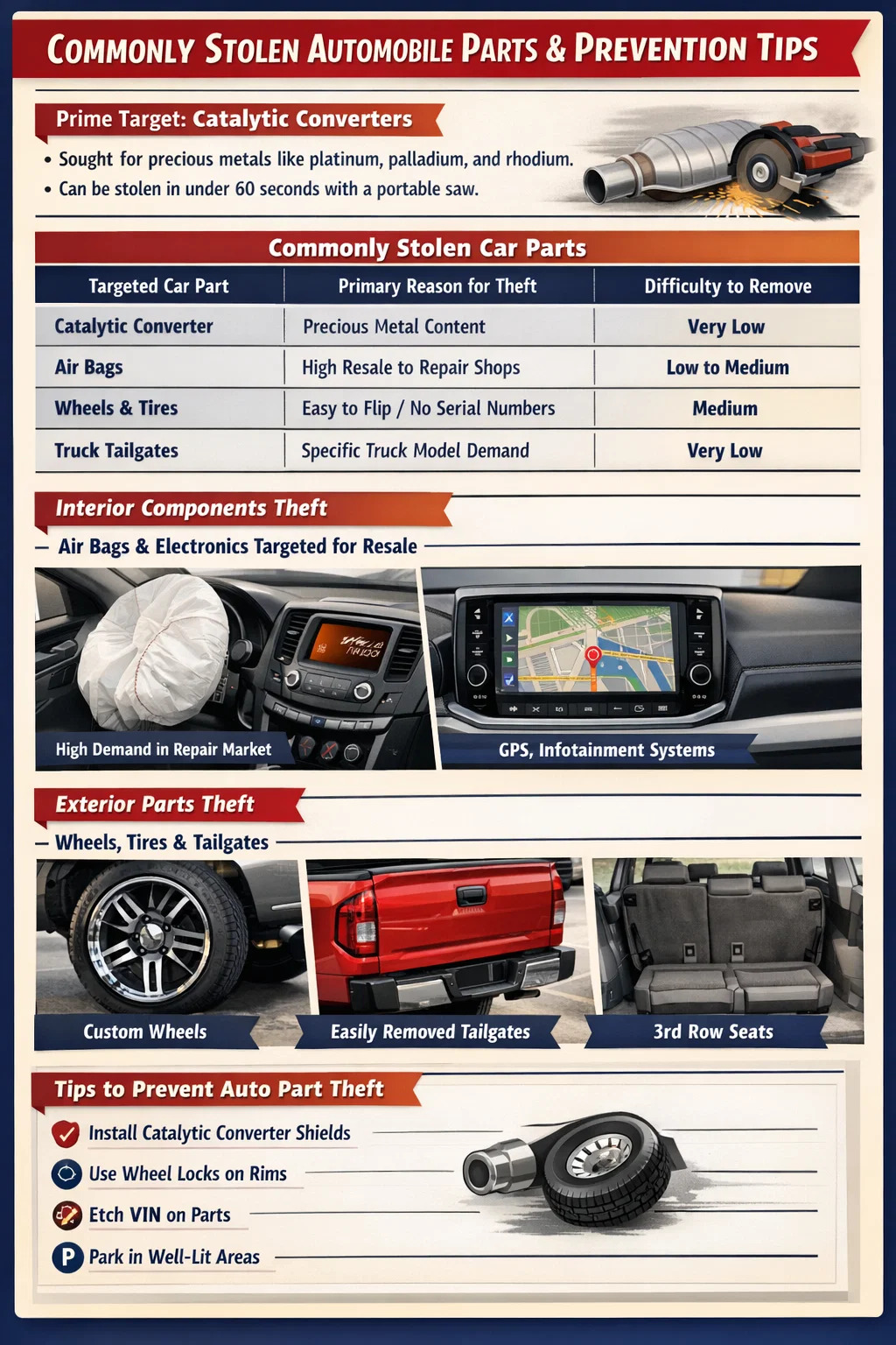 Los ladrones generalmente se concentran en piezas de automóvil que son fáciles de eliminar y difíciles de rastrear. La siguiente tabla destaca los objetivos más comunes y por qué son robados.